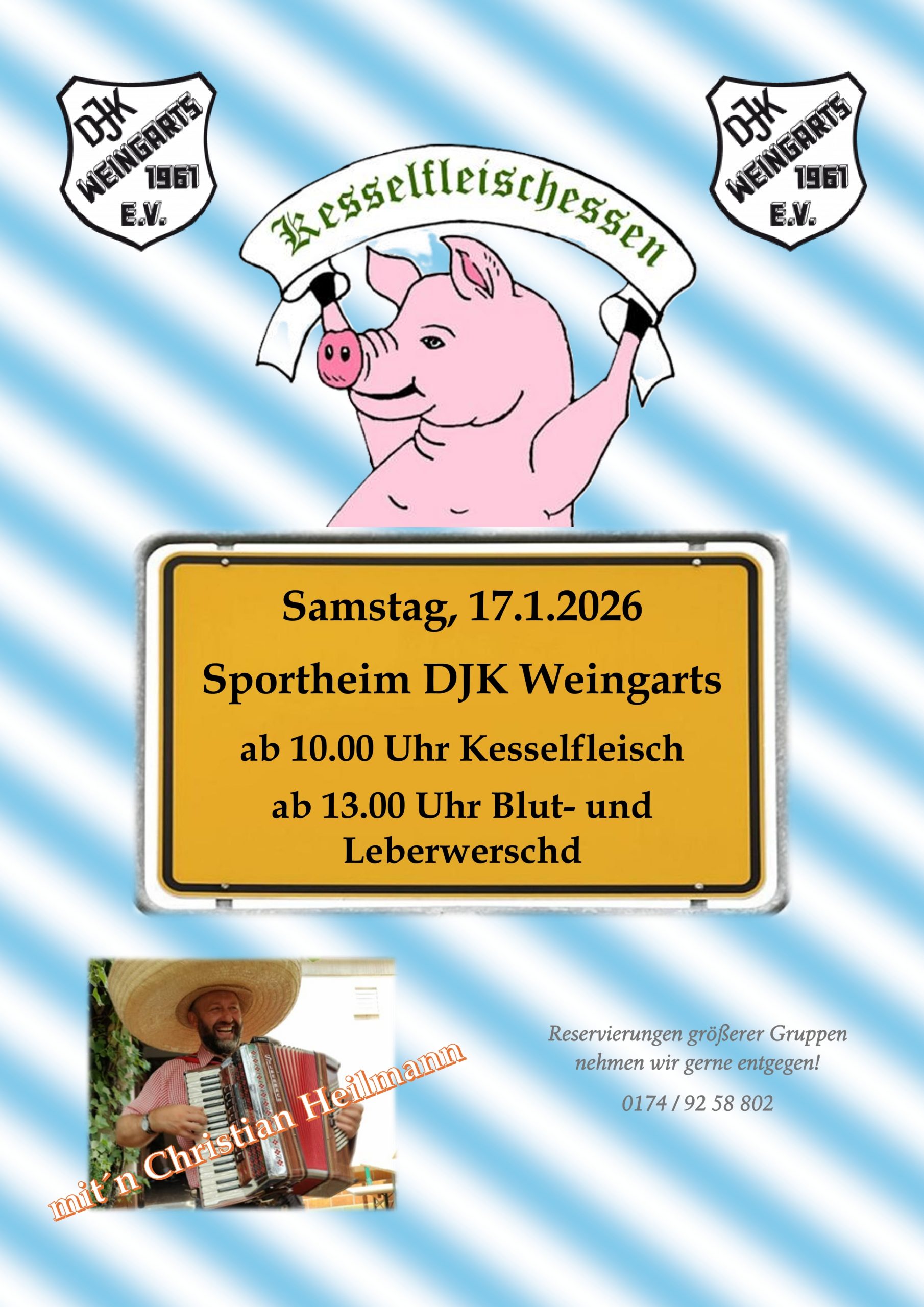 Die DJK Weingarts lädt herzlich zum Kesselfleischessen am Samstag, den 17.01.2026 im Sportheim der DJK ein.
