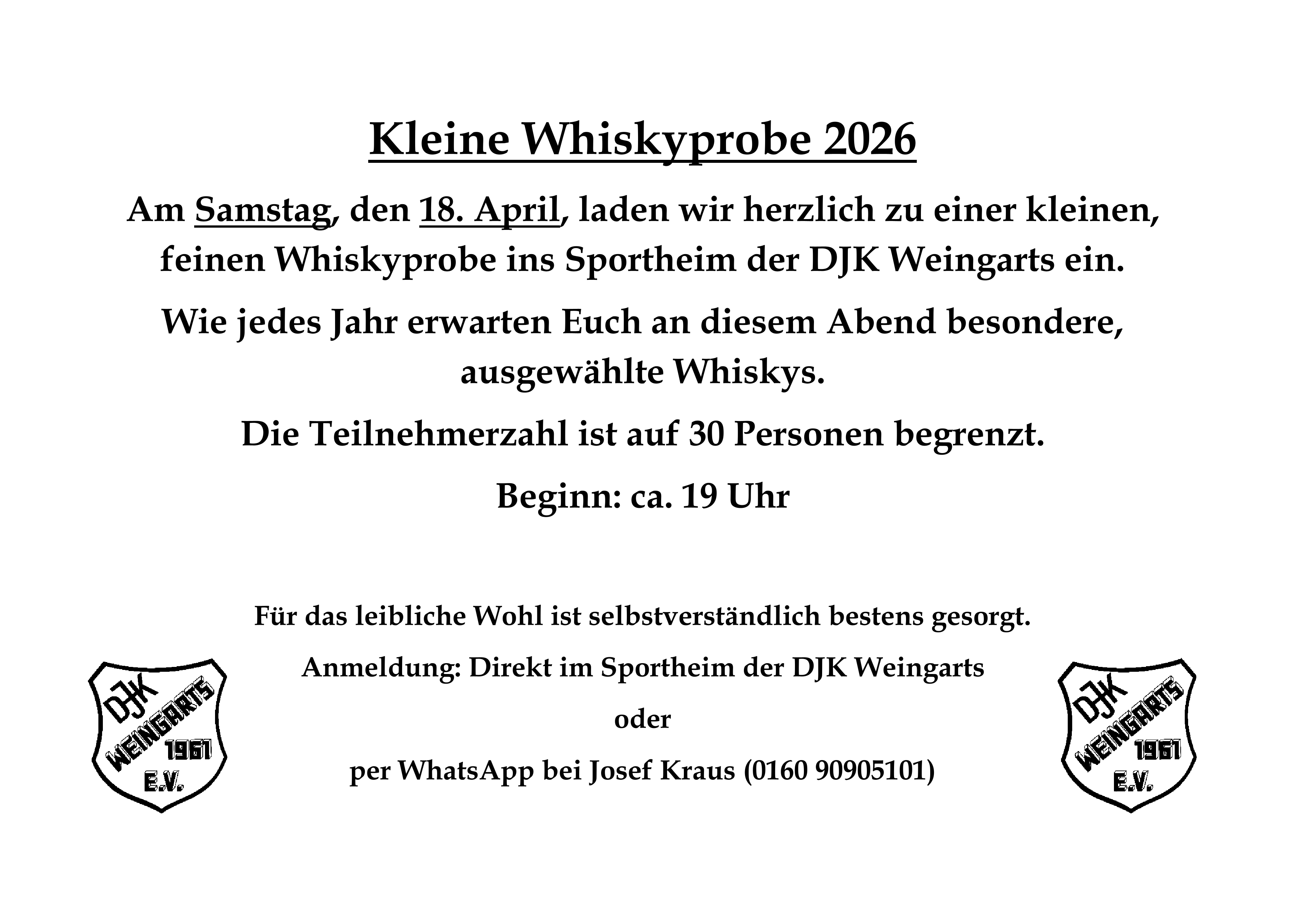 Kleine Whiskyprobe bei der DJK Weingarts 16. April 2026 / Johannes Alt Allgemein Vorheriger Beitrag Speisekarte der DJK im Mai 2026